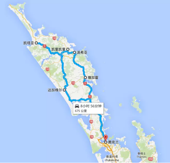 這條新西蘭租車(chē)自駕路線(xiàn)是從奧克蘭-旺格雷-派希亞-凱里凱里-凱塔亞-達格威爾-到奧克蘭