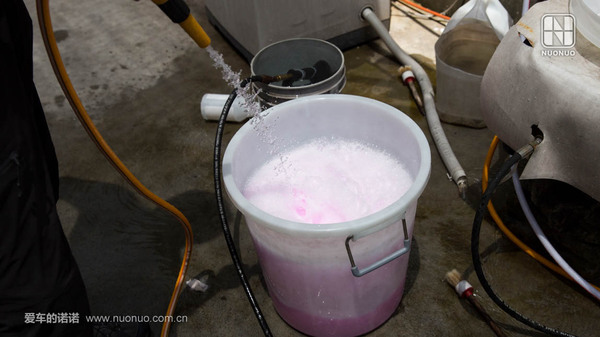 是個(gè)洗車(chē)的地方都會(huì )有這一步的,先濕潤一遍車(chē)身,然后打上清潔液。預洗的作用是讓附著(zhù)在車(chē)身上的砂石附著(zhù)力下降。